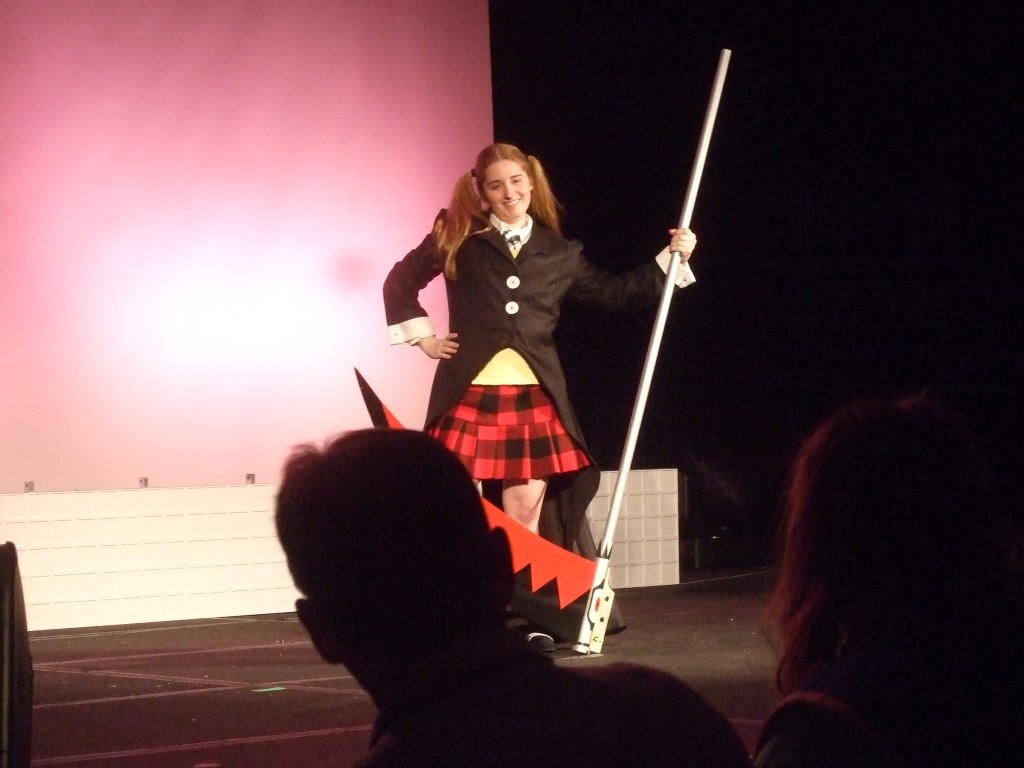 Girl with scythe is Maka from Soul Eater. Her outfit is really well done, as well as Soul (the scythe). Really cool :)